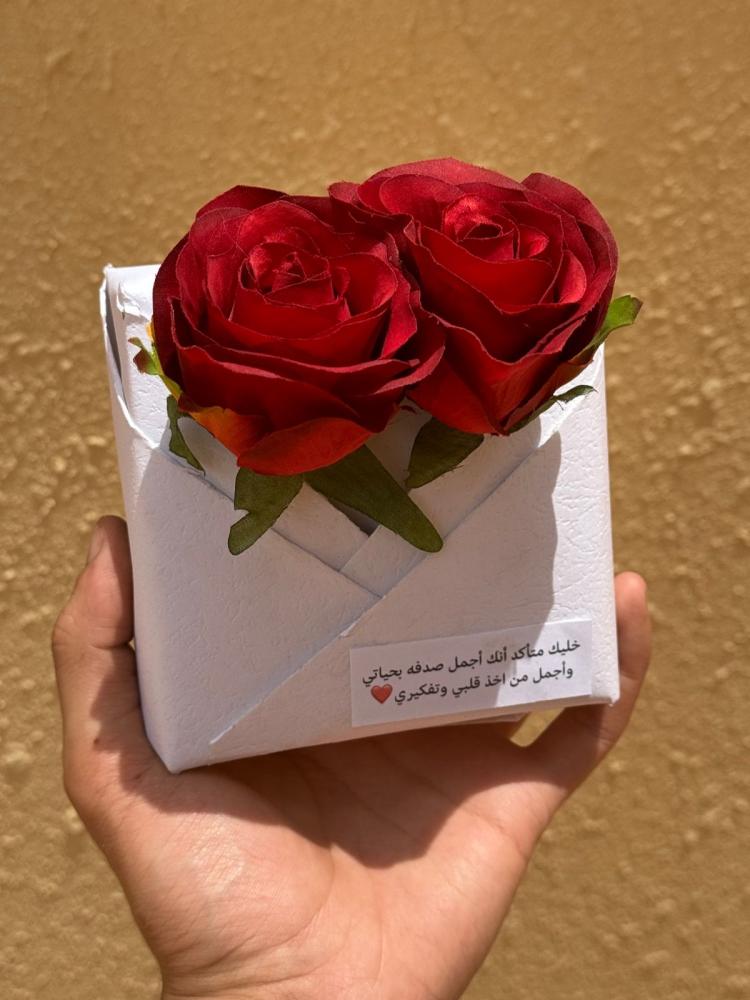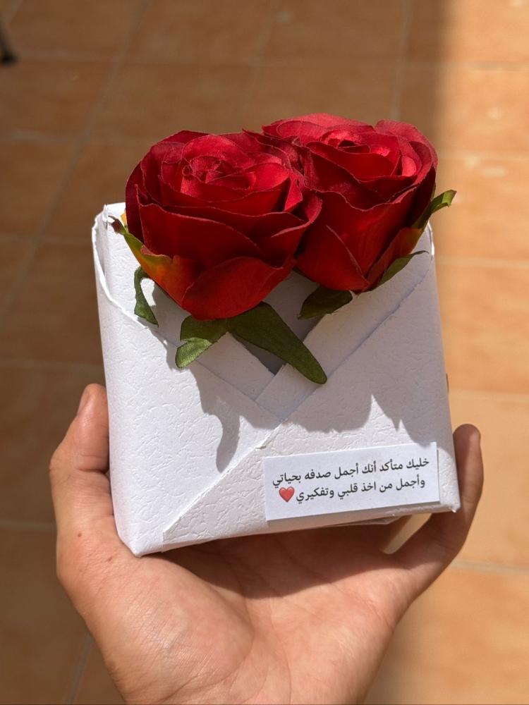 علبة هدية أنيقة مزينة بورود صناعي مصممة بإتقان مع رسالة عاطفية تضيف لمسة شخصية مثالية. تُعد الخيار الأمثل للتعبير عن مشاعرك في المناسبات الخاصة مثل عيد الحب، الأعياد، أو المناسبات الشخصية.